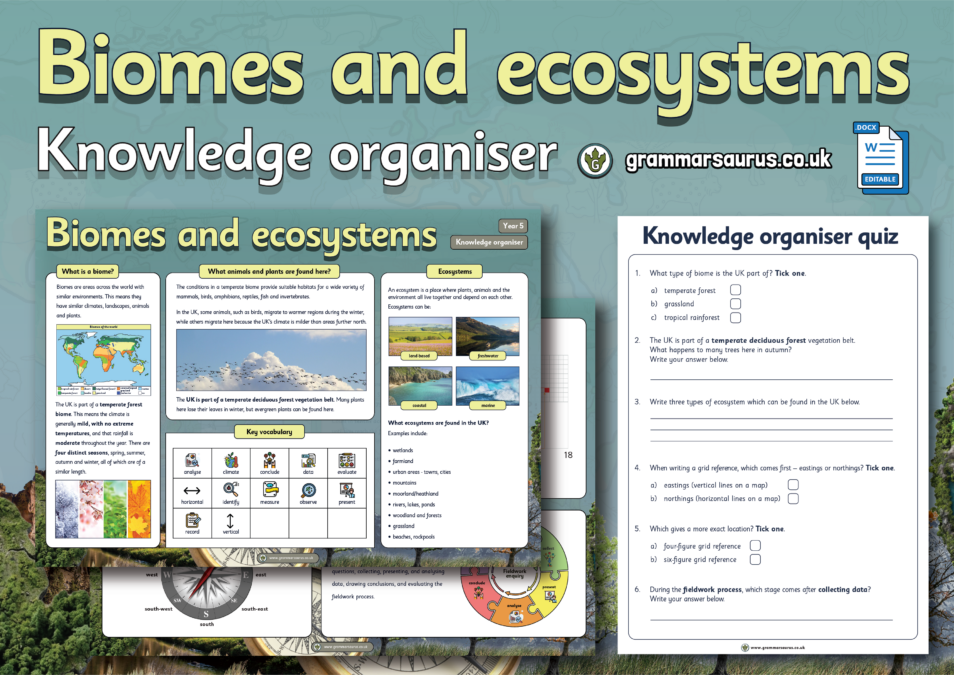 This editable knowledge organiser can support children as they learn about biomes, ecosystems, six-figure grid references, and applying the fieldwork process to explore the physical features (specifically ecosystems) found in their local area. It can be displayed in the classroom, placed on tables, sent home, or used for pre-teaching key vocabulary and concepts. -editable Knowledge organiser-mini quiz worksheet-mini quiz answers