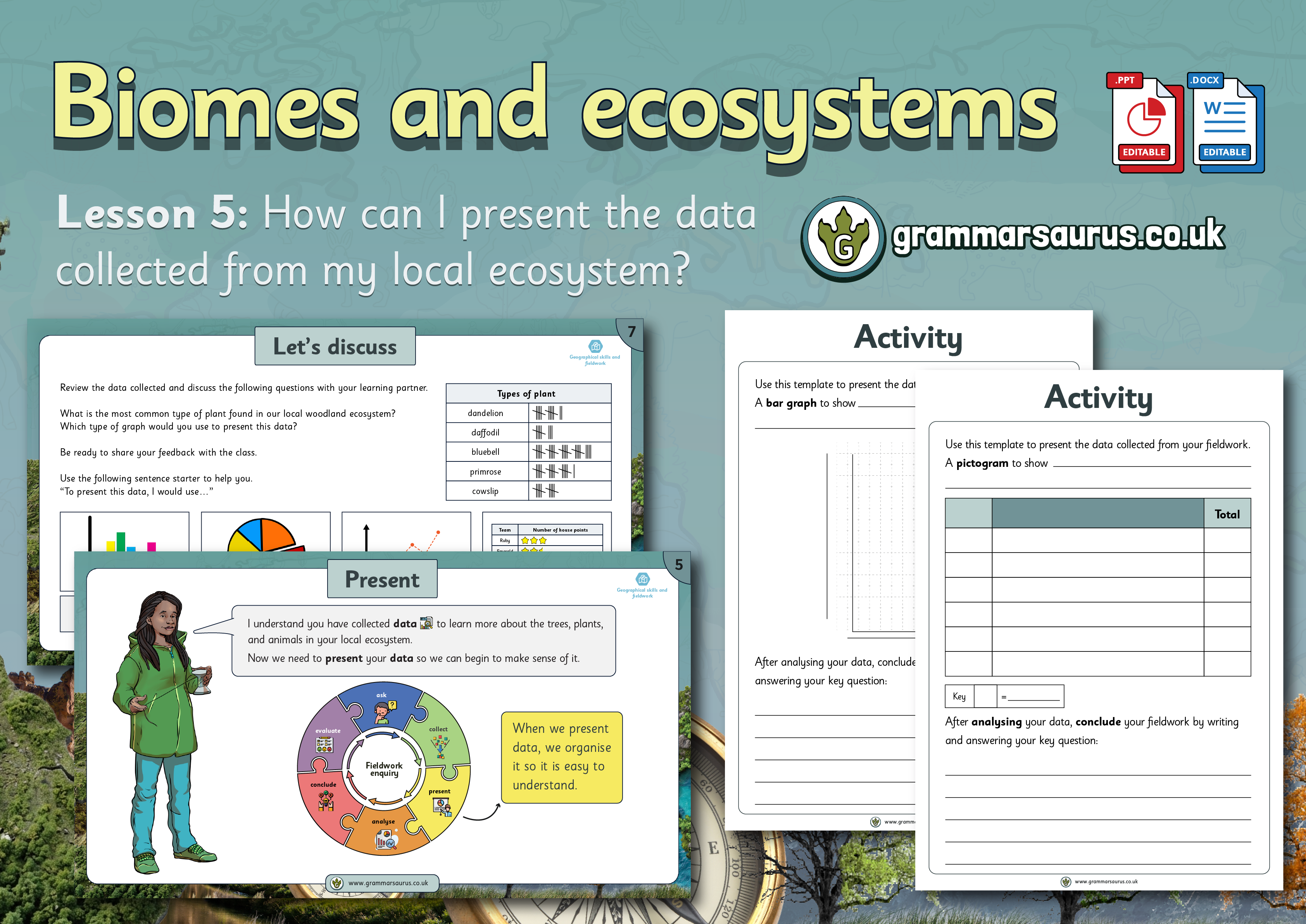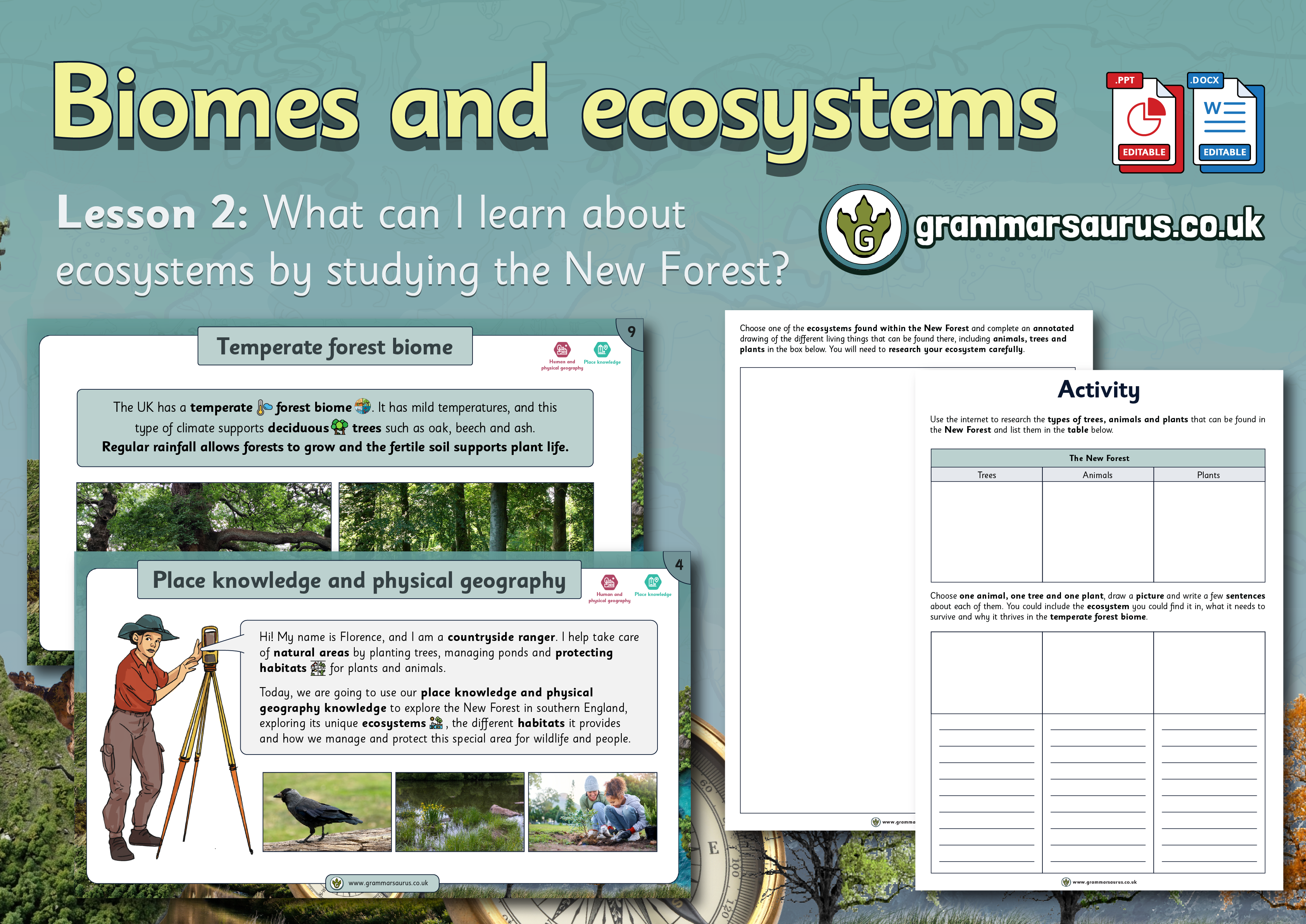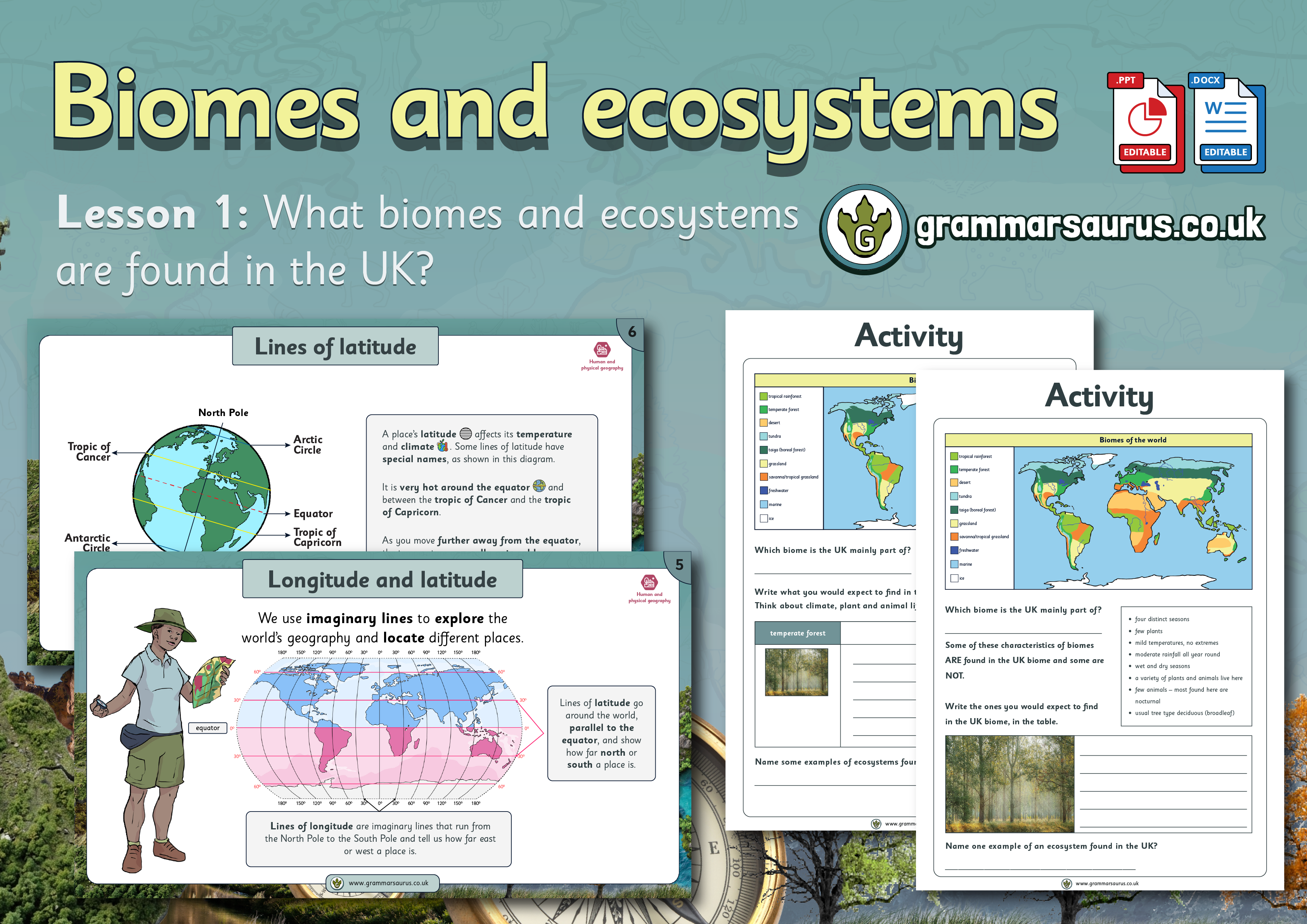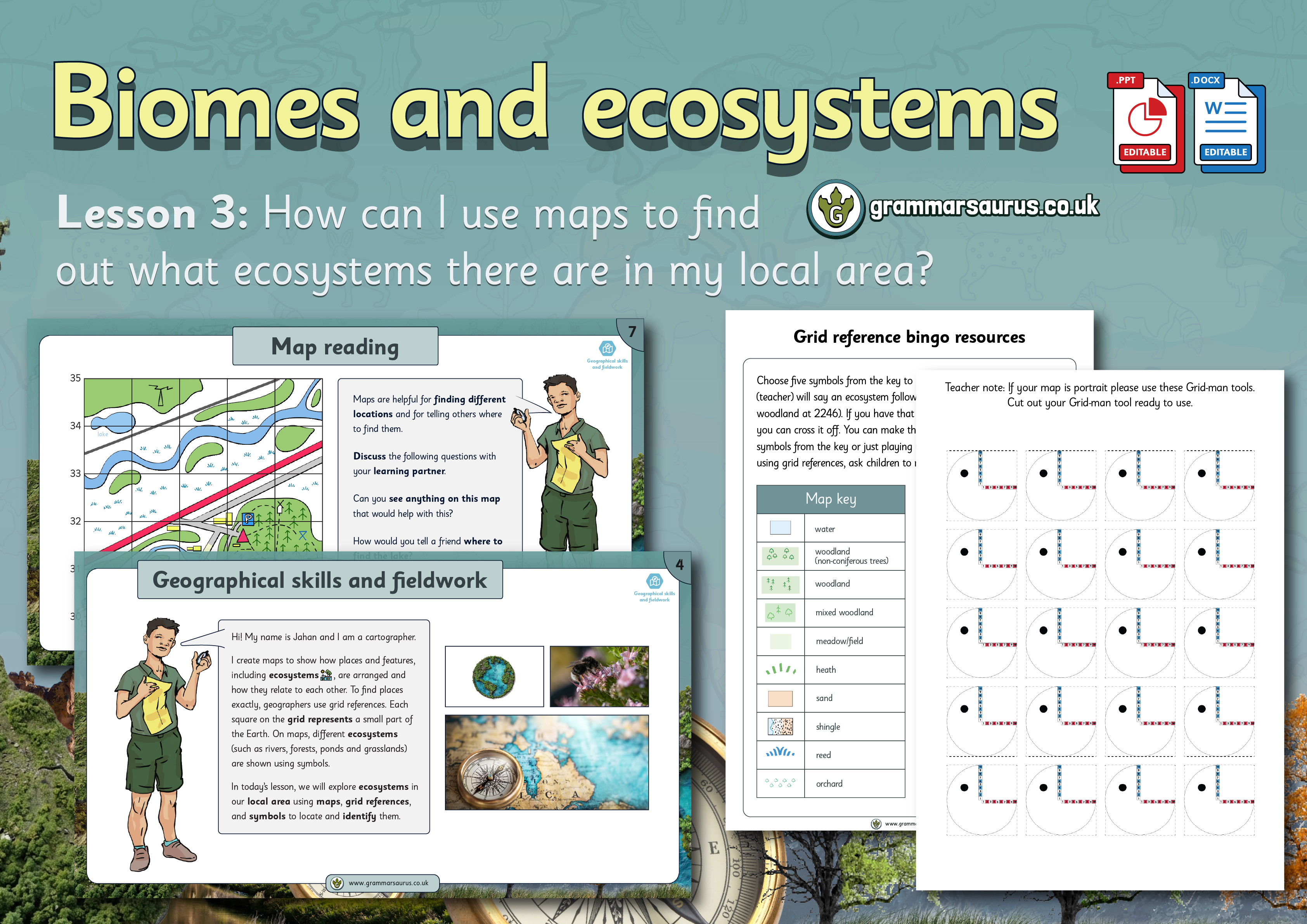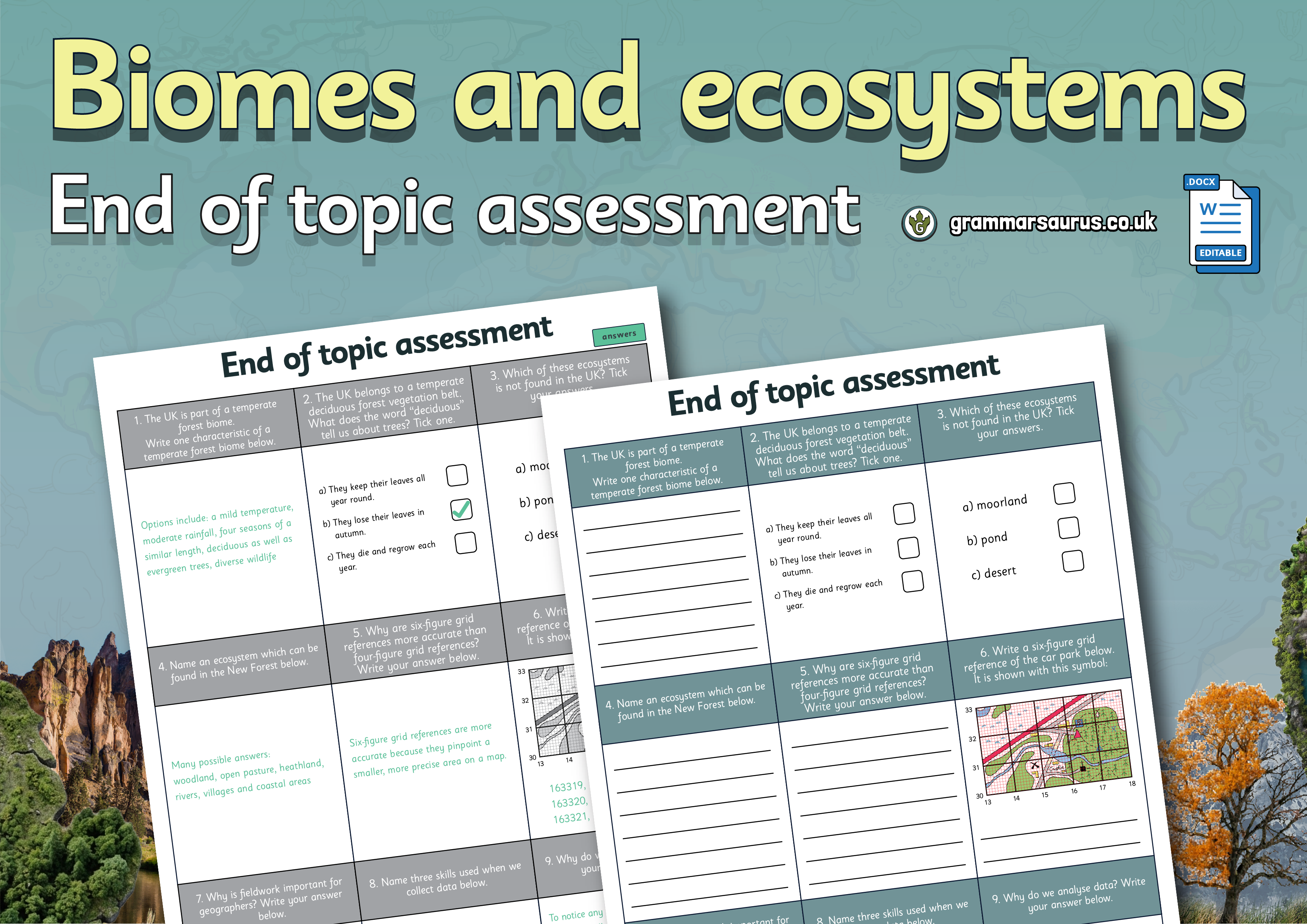 This editable knowledge organiser can support children as they learn about biomes, ecosystems, six-figure grid references, and applying the fieldwork process to explore the physical features (specifically ecosystems) found in their local area. It can be displayed in the classroom, placed on tables, sent home, or used for pre-teaching key vocabulary and concepts. -editable Knowledge organiser-mini quiz worksheet-mini quiz answers