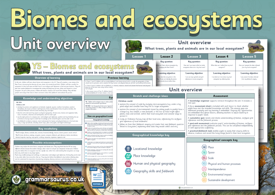 The file contains the following sections: – an overview of learning for this unit – previous and future learning linked to the unit – NC objectives that are covered within the unit – brief overview of each lesson including key question, learning objective, success criteria, links to cumulative quiz questions, and geographical knowledge and concept threads covered within each lesson – misconceptions that the children might have – key tier 2 and tier 3 vocabulary to explain and teach – stretch and challenge ideas – assessment suggestions Updated to the Grammarsaurus Curriculum 2.0...