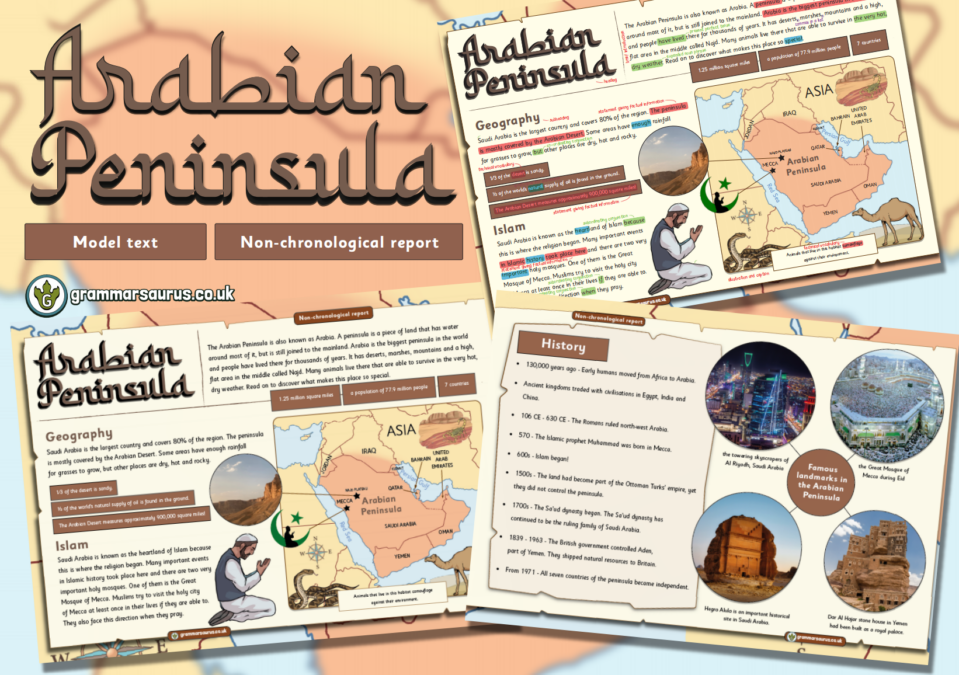 This model text is a non-chronological report about the Arabic Peninsula. It has been written to meet the Year 3 expected standard and comes with a handy annotated version detailing the text-type specific features (red), grammar (green), punctuation (purple) and spelling (blue) teaching opportunities should you wish to use this text with your learners.