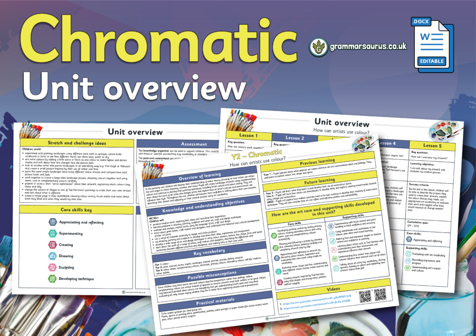 This editable unit overview offers a medium-term plan for Year 2's ‘Chromatic’ art topic. The file includes the following resources:– links to prior and future learning related to the topic– National Curriculum (NC) objectives covered in the unit– a brief overview of each lesson– common misconceptions students may have– key vocabulary for teaching and explaining- core and supporting skills covered in the unit– practical materials required– links to YouTube how to videos– ideas for stretching and challenging students– suggestions for assessment