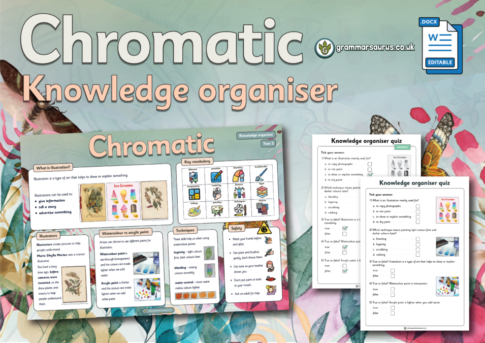 This editable knowledge organiser accompanies our Year 1 ‘Chromatic’ unit lessons. The file includes the following resources: - editable knowledge organiser - editable knowledge organiser test worksheets - editable knowledge organiser test answers Updated to the Grammarsaurus Curriculum 2.0...
