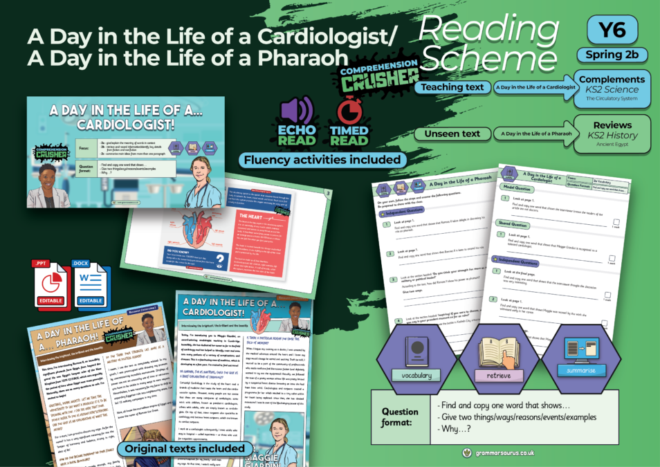 This comprehension crusher reading scheme pack includes two recounts in the format of interviews, one with a cardiologist and one with an Egyptian pharaoh. The first text, that accompanies the teaching slides, is an informative and engaging discussion with a cardiologist, who details her working day, passion for this field of medicine and insights into the role of a cardiologist. It meets the Year 6 expected standard and comes with three sets of comprehension questions, based on three curriculum content domains (vocabulary, retrieval and summary). The teaching slides provided, along with the questions sets, allow for in depth practice of each individual question type.