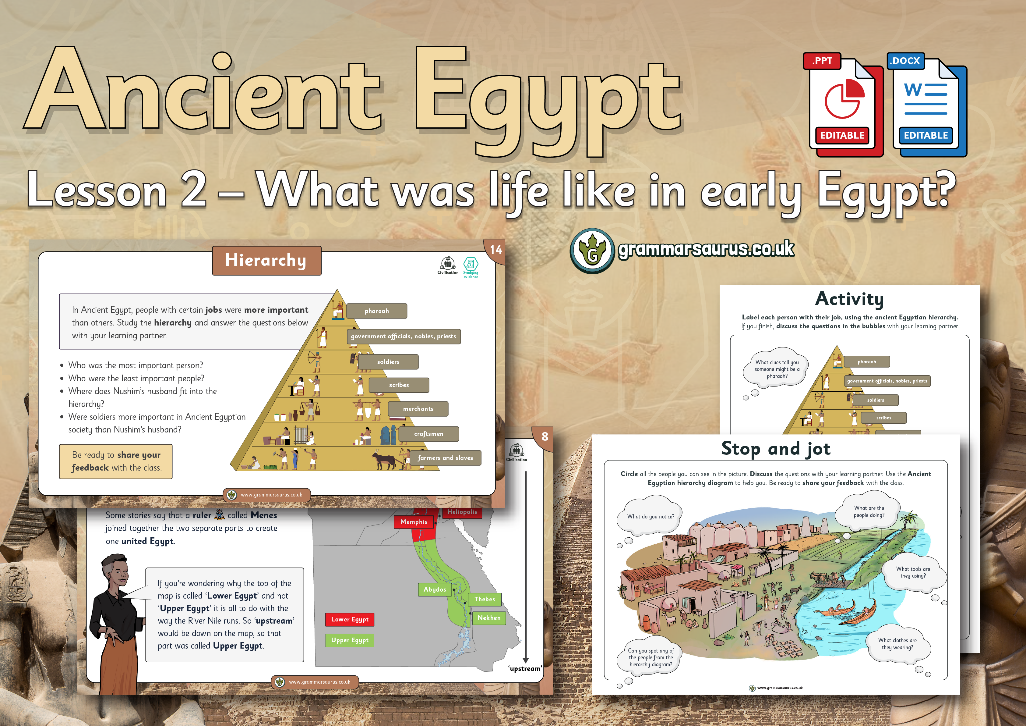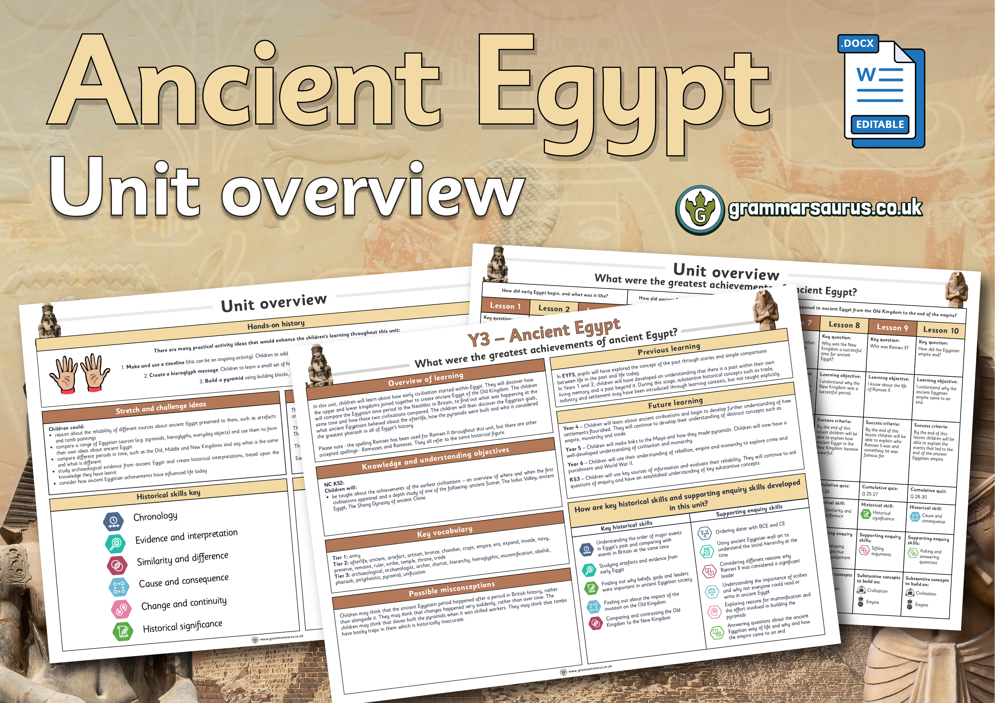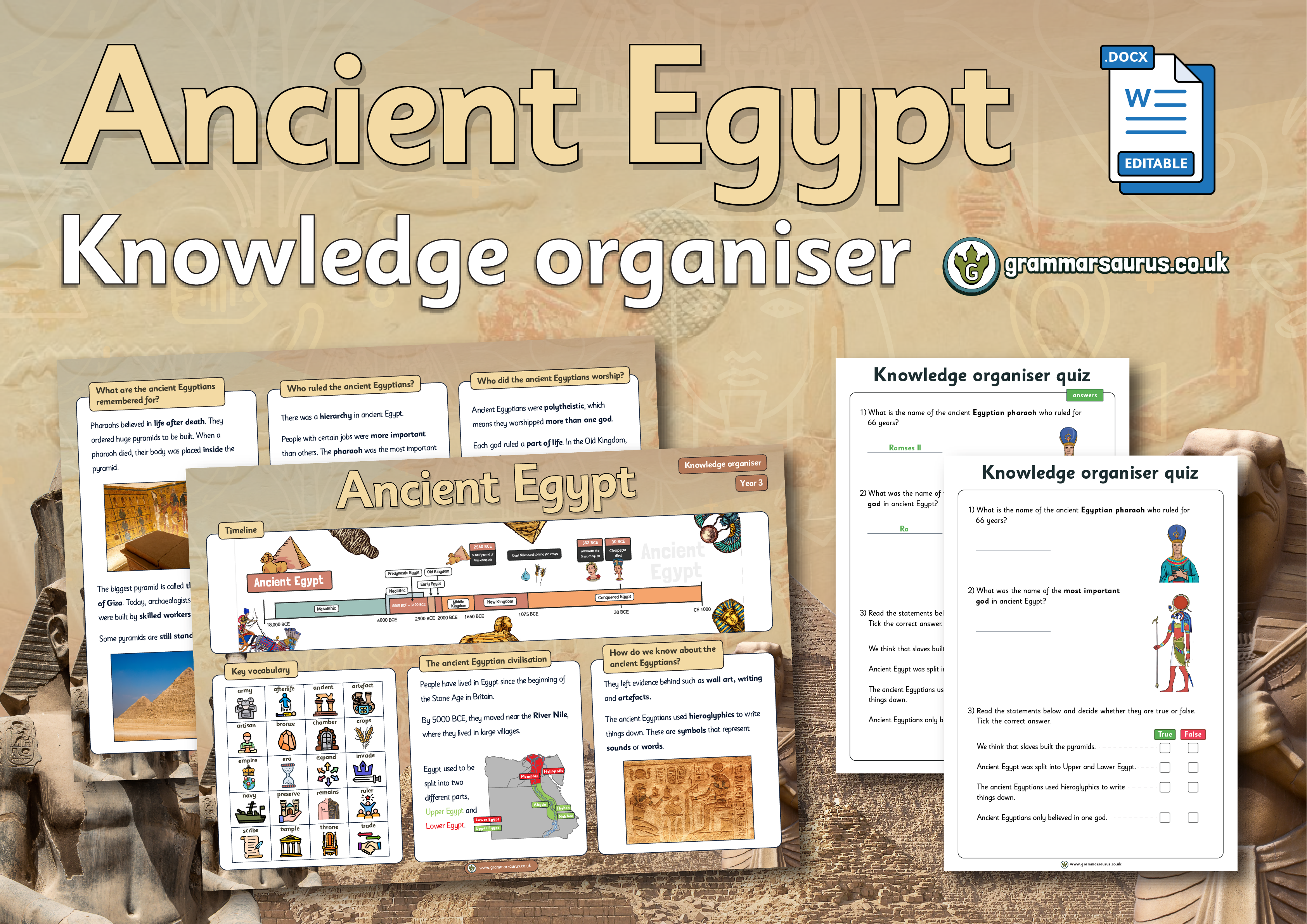 Teachers can use this cumulative quiz and the questions to assess children throughout the Year 3 'Ancient Egypt' unit. The cumulative quiz and questions can also be used at the end of each lesson to give immediate feedback to inform future planning and identify children who do not understand. This is also available in a one-page document for quick reference. The ‘Ask us this’ document has questions for verbal responses.