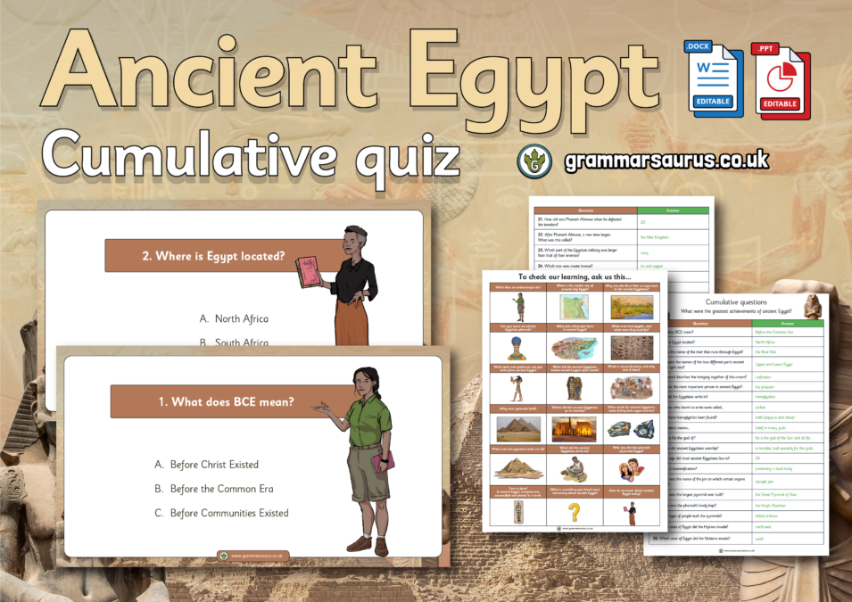 Teachers can use this cumulative quiz and the questions to assess children throughout the Year 3 'Ancient Egypt' unit. The cumulative quiz and questions can also be used at the end of each lesson to give immediate feedback to inform future planning and identify children who do not understand. This is also available in a one-page document for quick reference. The ‘Ask us this’ document has questions for verbal responses. The file includes the following resources: - cumulative quiz presentation and answers - cumulative questions on one page - 'Ask us this' questions - 'Ask us this' answers