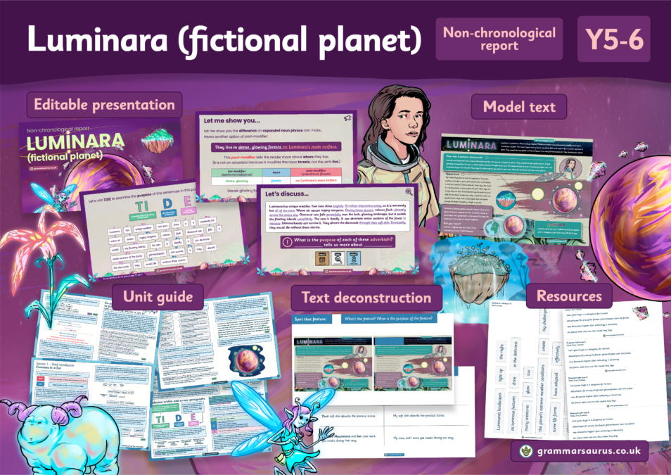 Grammarsaurus unit guides are designed to support teachers in creating a bespoke learning journey for their children. Each step of the journey has its purpose outlined along with our recommendations. Following that, the structure of the step is detailed in an easy-to-follow sequence, and to make things even simpler for you, we’ve exemplified this sequence with a suggested lesson fit for this unit.