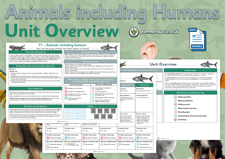 This editable unit overview provides a medium-term plan for the Y1 animals including humans.