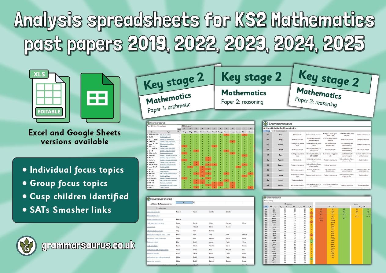 This pack comprises QLA (question level analysis) spreadsheets for the 2019, 2022, 2023, 2024 and 2025 KS2 SPaG SATs papers.These are designed to work on Office 365 (please note that some formulae may not work if you are not using Office 365). A Google Sheets version is available in the How-to document (please use this if you do not have access to Office 365).