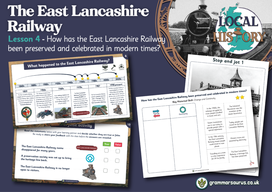 This editable lesson pack focuses on the key historical skills of change and continuity. The children will consider what has changed and what has stayed the same about the East Lancashire Railway. They will also consider why the ELR heritage line has been restored and preserved and how it is used today.