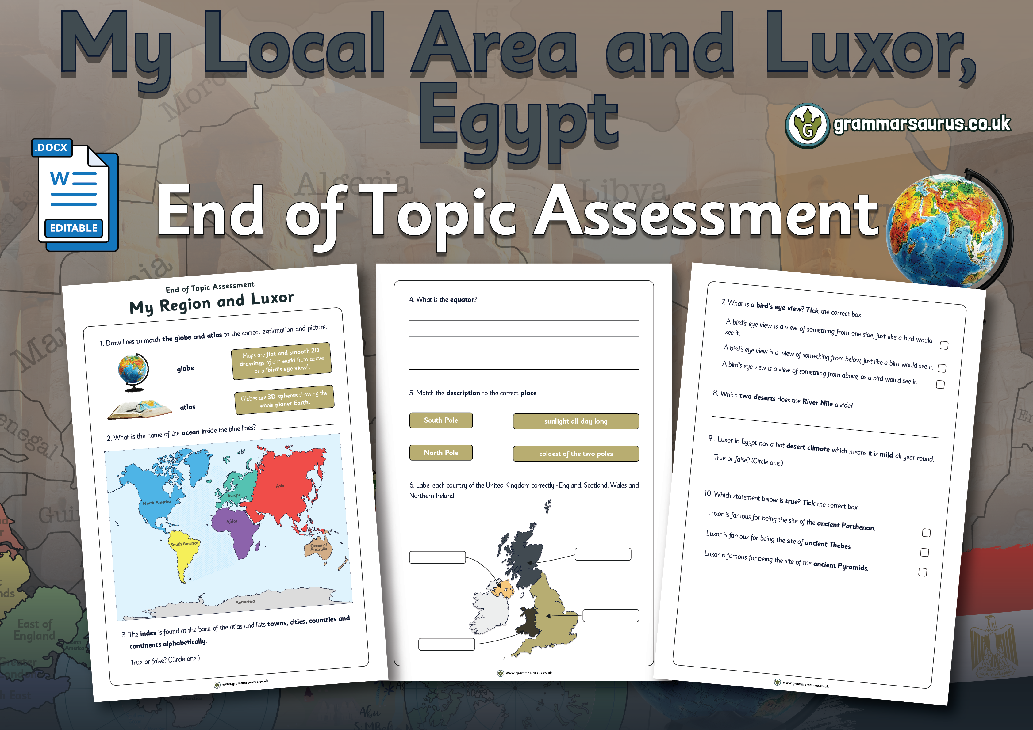 This is an editable cumulative quiz with questions that can be used to assess children throughout the Year 2 My Local Area and Luxor, Egypt unit. The quiz questions will link directly to each objective....
