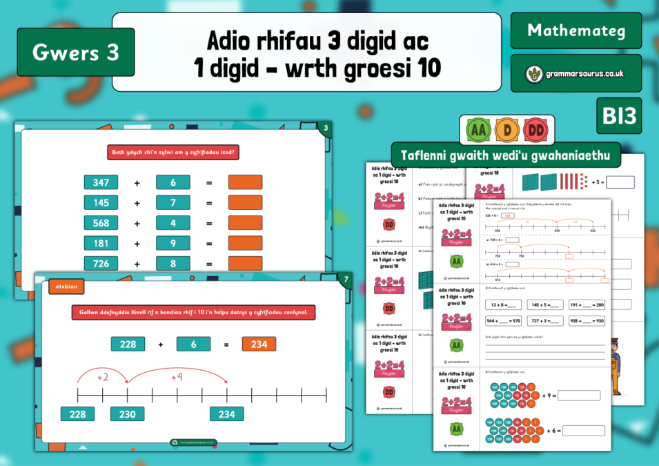 Blwyddyn 3 – Adio rhifau 3 digid ac 1 digid – wrth groesi 10 – Gwers 3