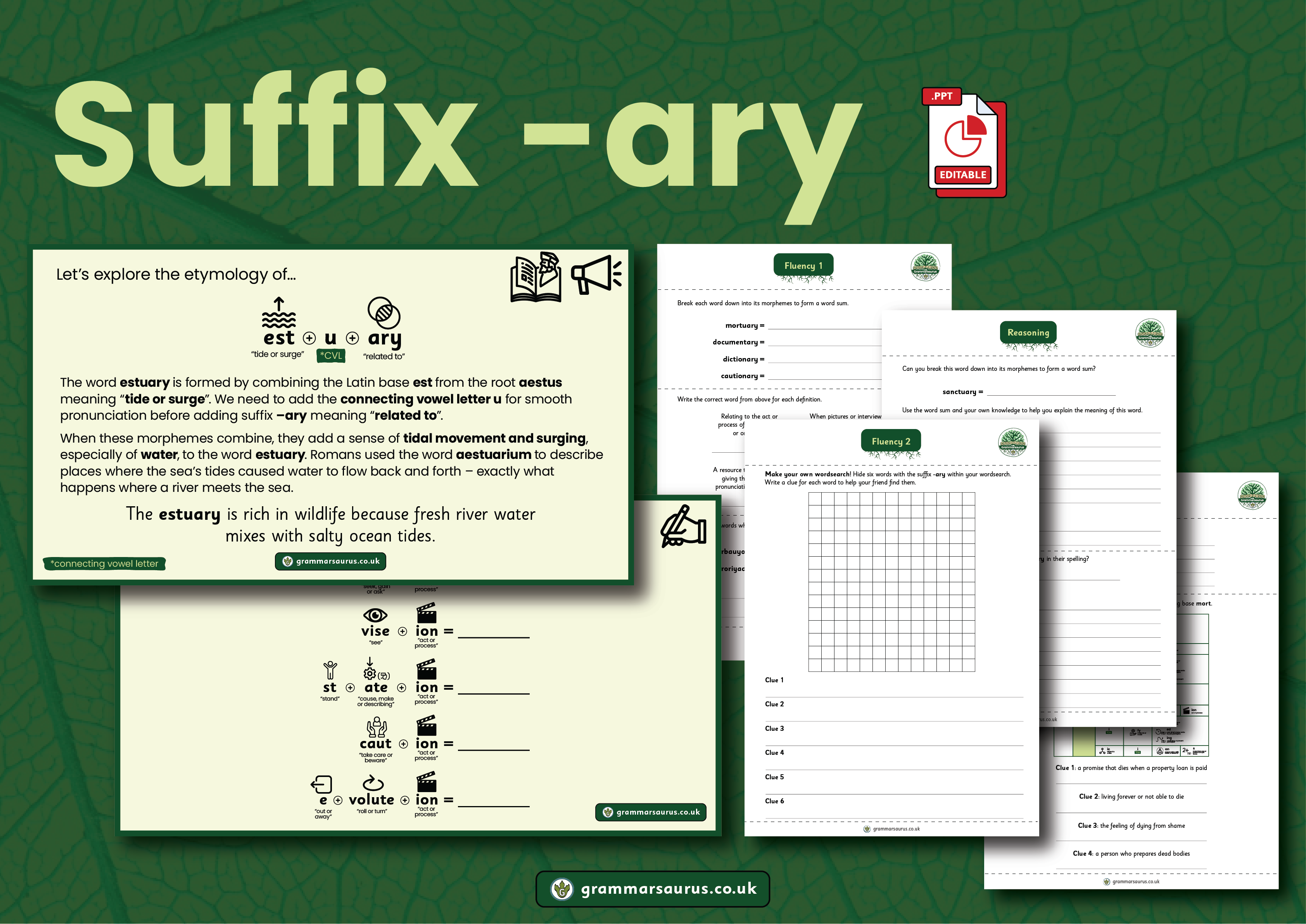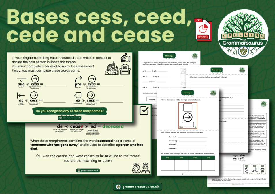 Prior to this objective, teachers should assess the suggested morphemes for Instructions text using the provided materials. If learning is secure, proceed to the bases cess, cede, cede and cease objective; otherwise, refer to resources for additional support on suffix -ful, suffix ly, suffix -er, suffic -or – Y2 and suffix -al, suffix -ise and bases fy, fic, and fice -ing – Y4 In this objective, children will learn how to combine bases cess, ceed, cede and cease with other morphemes to form new words. Over three 20-minute lessons, they will: · Learn that bases cess, ceed, cede and cease carry the meaning "go, leave, move or withdraw" · Develop their understanding of alternate bases · Solve word sums and explore word families · Recap suffixing rules · Develop their understanding of how combining different morphemes contributes to overall meaning · Use a matrix to combine morphemes with base cess Resources included: · Editable PowerPoint covering 3 lessons (20 minutes each) · Teacher guidance with optional activities · Supporting worksheets · A range of practical activities including word chain games and giving advice based on the Disney song ‘Bare Necessities’ · 2 fluency activities (with answers) · A reasoning activity (with answers)...