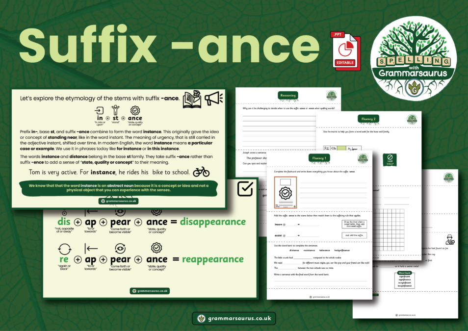 Resources included: · Editable PowerPoint covering 4 lessons (20 minutes each) · Teacher guidance with optional activities · Supporting worksheets · A range of practical activities including: creating a story chain using relevant words and a game to decide if a recognisable word has been formed when combining a base or stem with suffix -ance or suffix -ant