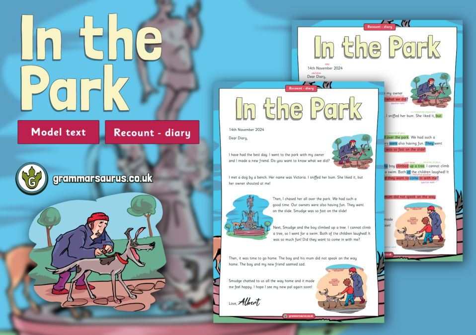 This model text is a diary entry written in role as a dog who has met a friend at the park! It has been written to meet the Year 1 expected standard and comes with a handy annotated version detailing the text-type specific features (red), grammar (green), punctuation (purple) and spelling (blue) teaching opportunities should you wish to use this text with your learners.