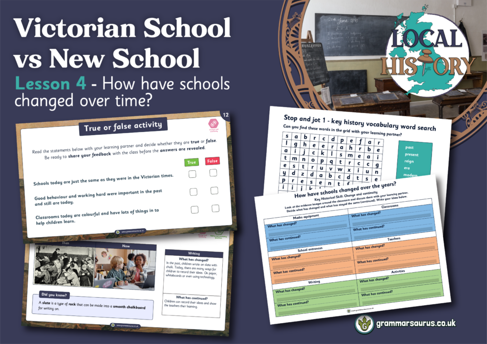 This editable lesson pack focuses on the key historical skill of change and continuity. Children will consider what parts of school life have continued into the present day and also what things have changed.
