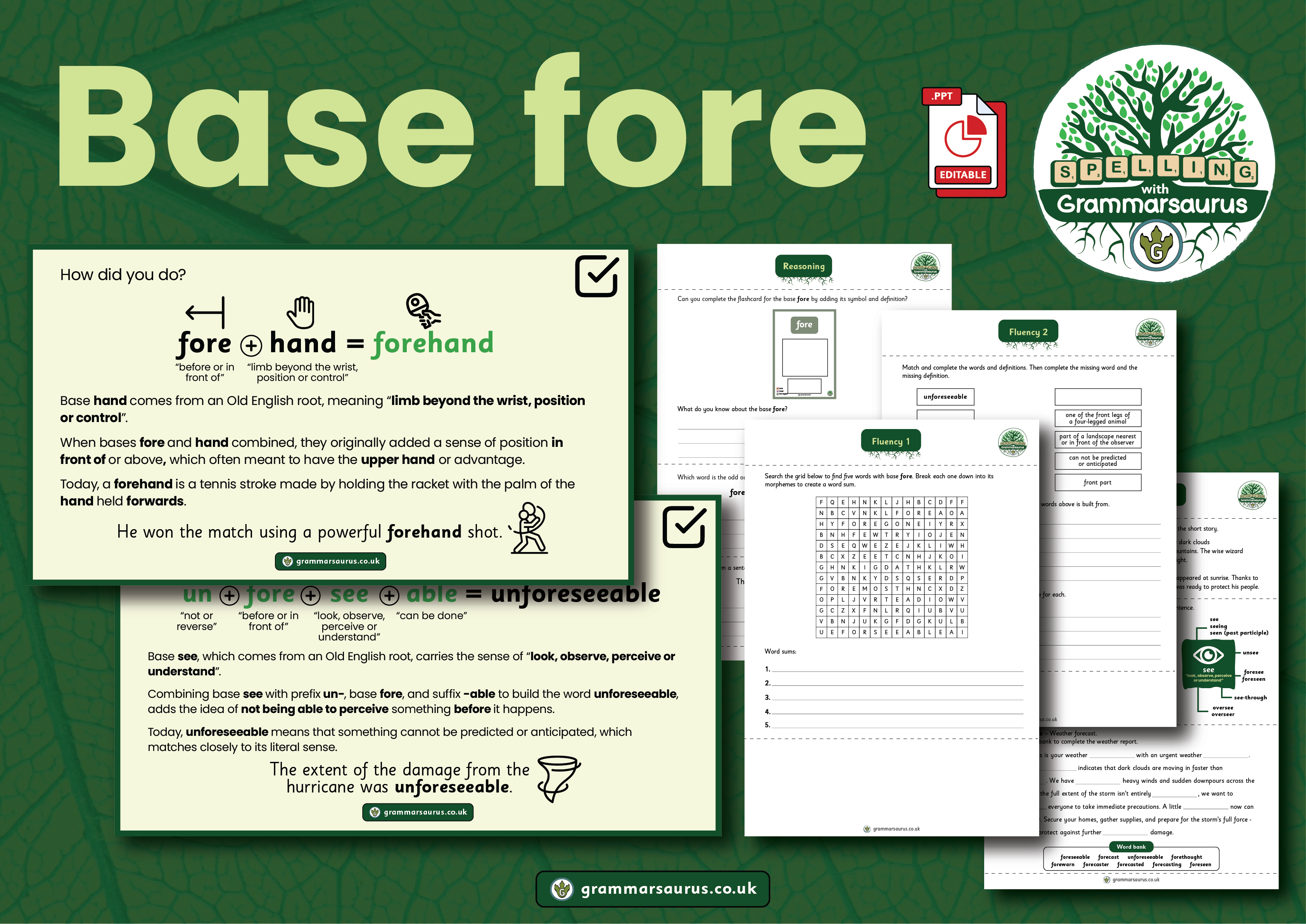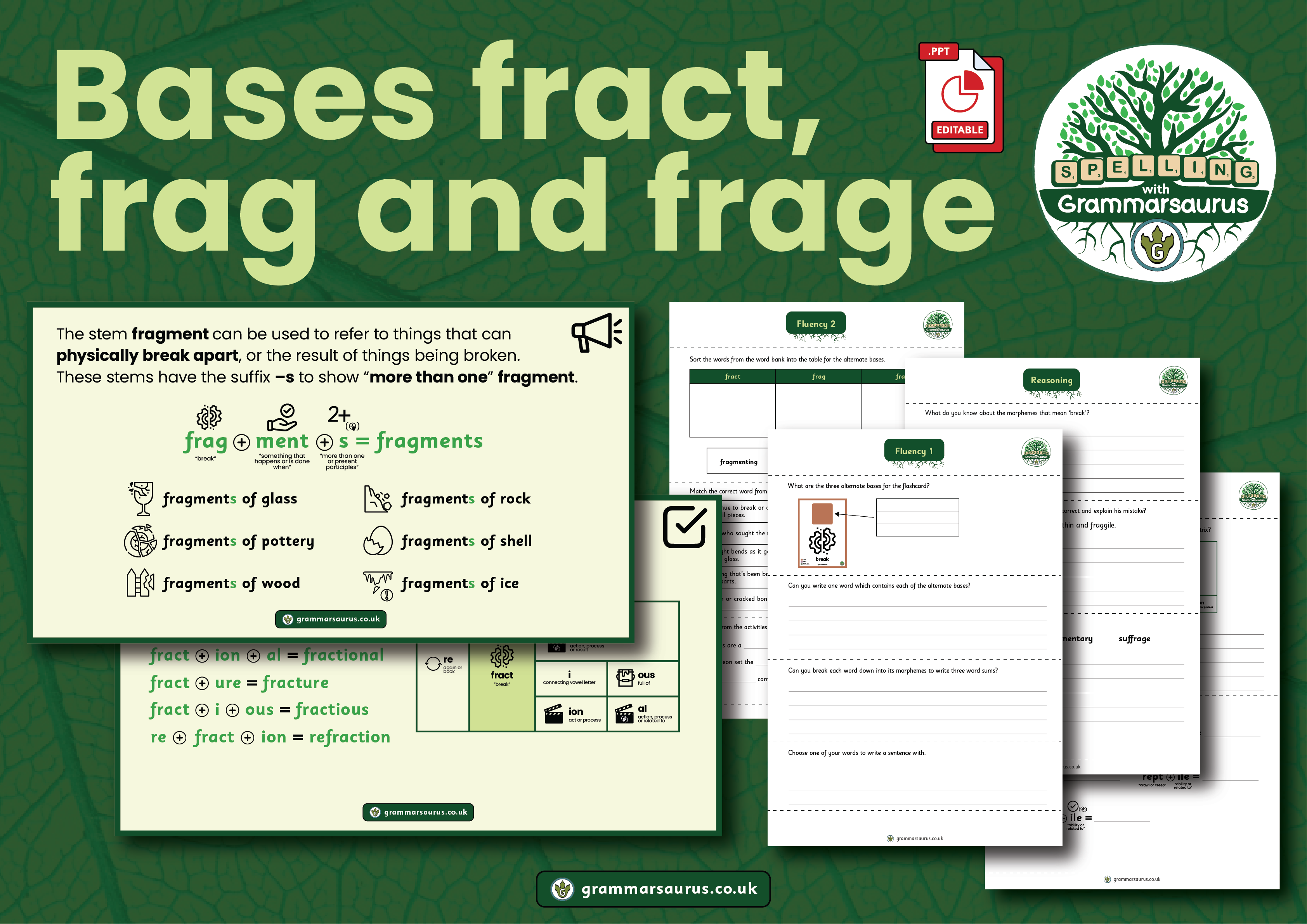 Learn that base fer carries the meaning "bear or carry" Combine prefixes to form stems with base fer Explore the etymology of words containing base fer Use a matrix with the stem differ to form words Recap learning of stressed vowels Consider the stress of spoken syllables in stems with base fer Double the final consonant in the base fer before adding a vowel suffix - but only if its final syllable is stressed Use a matrix to combine prefixes and suffixes with the base fer Use words with base fer in sentences Recognise the correct spelling of words with base fer Learn that base fert is an alternate form of base fer Explore words that contain base voce Reinforce learning with practical activities Resources included: Editable PowerPoint covering 3 lessons (20 minutes each) Teacher guidance with optional activities Supporting worksheets Activities including: Ferdinand's ferry, circumference word sums and word detective lesson Matrices 2 fluency activities (with answers) A reasoning activity (with answers)...