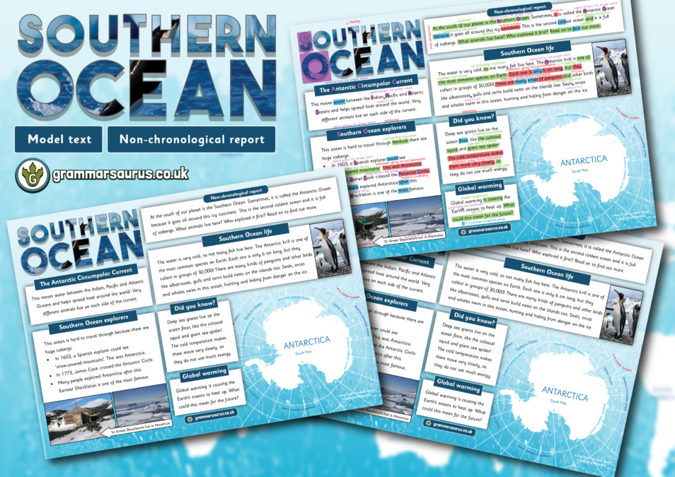 This model text is a non-chronological report about the Southern Ocean. It has been written to meet the Year 2 expected standard and comes with a handy annotated version detailing the text-type specific features (red), grammar (green), punctuation (purple) and spelling (blue) teaching opportunities should you wish to use this text with your learners.