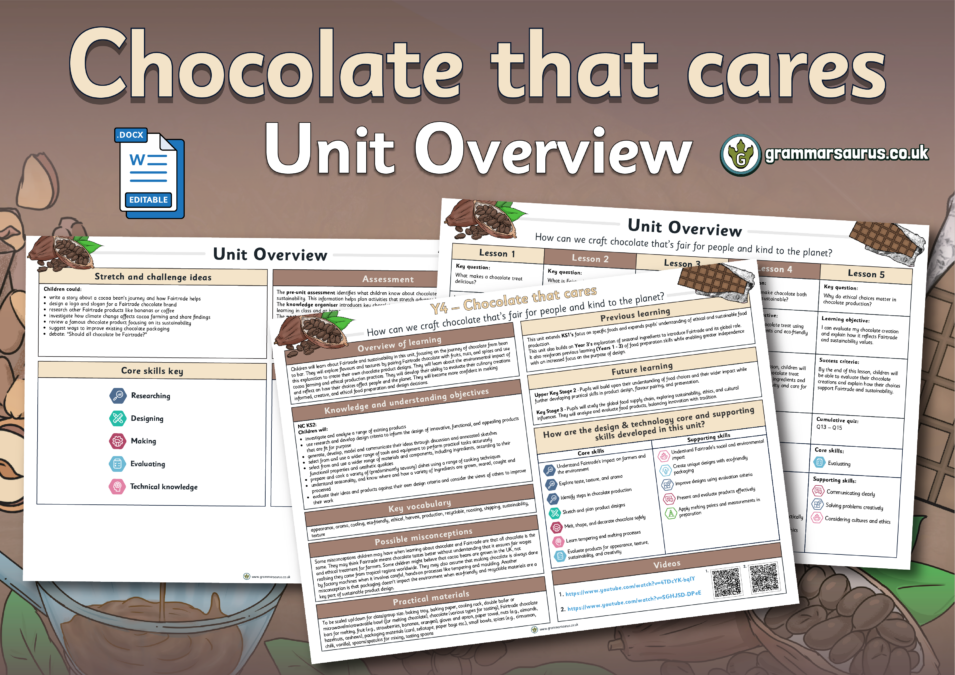 This editable unit overview offers a medium-term plan for Year 4's ‘Chocolate that cares’ topic.