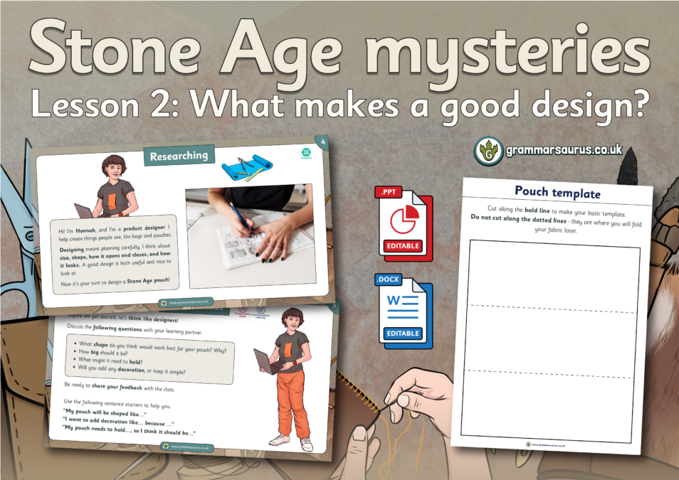 This editable lesson focuses on the core Design and Technology (DT) skill of designing, helping children to create a paper template for their Stone Age-style pouch. Children will plan the size, shape, and features of their design, as well as fold their template to test its function, and annotate it with ideas for decoration.