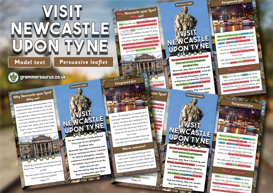 This Year 4 model text is a piece of persuasive writing trying to convince tourists to visit Newcastle. It has been written to meet the Year 4 expected standard and comes with a handy annotated version detailing the text-type specific features (red), grammar (green), punctuation (purple) and spelling (blue) teaching opportunities should you wish to use this text with your learners.