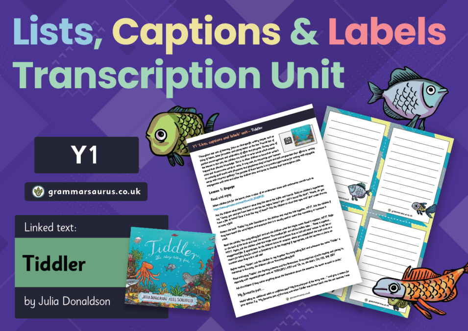 This unit is based on the book ‘Tiddler’ by Julia Donaldson. This unit is designed to provide lots of engagement with the text, oral activities and transcription of lists, captions and labels. These units are recommended to be completed to develop children’s transcription skills before moving on to our PVPG units....
