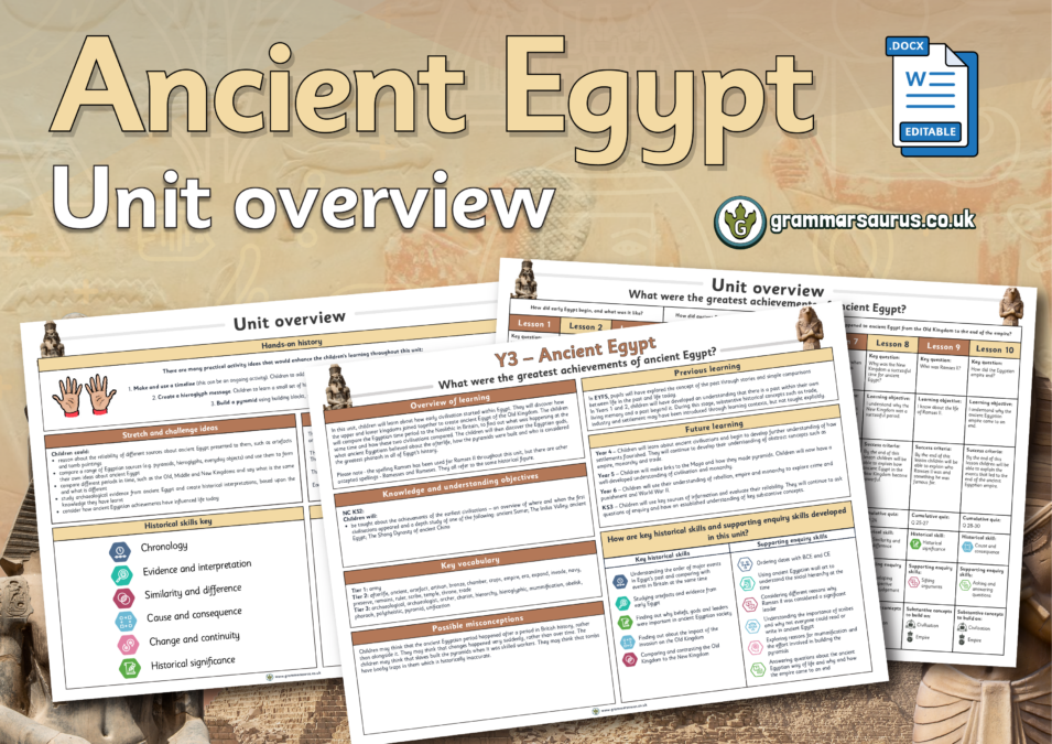 This editable unit overview offers a medium-term plan for Year 3's ‘Ancient Egypt’ topic. The file includes the following resources:– links to prior and future learning related to the topic– National Curriculum (NC) objectives covered in the unit– a brief overview of each lesson– common misconceptions students may have– key vocabulary for teaching and explaining– ideas for stretching and challenging students– suggestions for assessment Updated to the Grammarsaurus Curriculum 2.0...