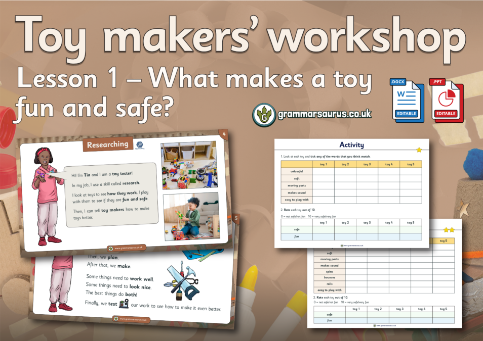 This editable lesson focuses on the core Design and Technology (DT) skill of researching, helping children to explore and test a range of toys. Children will play with examples to discover what makes them fun and what makes them safe. They will talk about how toys work, discuss materials and share ideas about how fun and safety can be balanced.