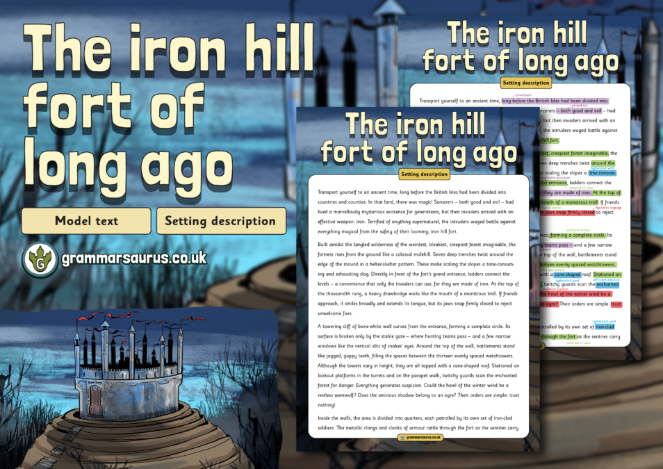 This model text is a setting description of a iron hill fort built by invaders of a magical, long ago, world. It has been written to meet the Year 5 expected standard and comes with a handy annotated version detailing the text-type specific features (red), grammar (green), punctuation (purple) and spelling (blue) teaching opportunities should you wish to use this text with your learners.