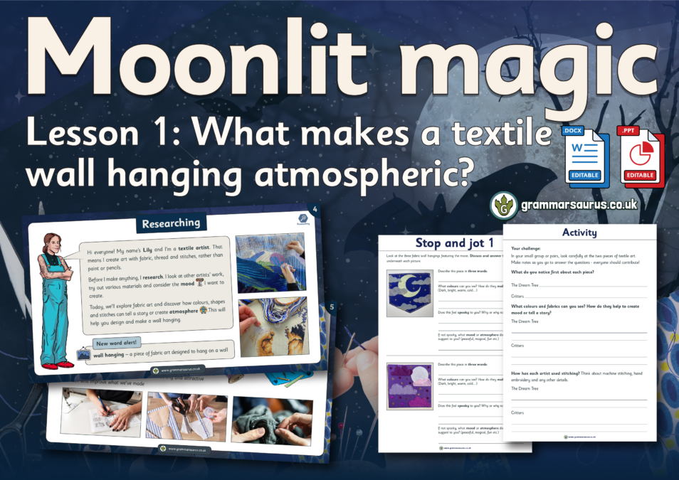 This editable lesson pack focuses on the core Design and Technology (DT) skill of researching. In this lesson, children will explore how contemporary textile artists like Louise Gardiner and Tilleke Schwarz use colour, stitching and fabric to tell stories and create mood. Through group discussions and image comparisons, children will investigate how textile art can be both expressive and atmospheric.