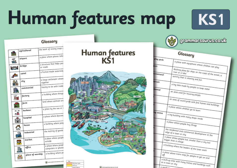 This illustrated poster set includes a map for KS1, showing the key human features covered in the Geography curriculum. It also comes with a handy glossary that provides clear, child-friendly definitions.