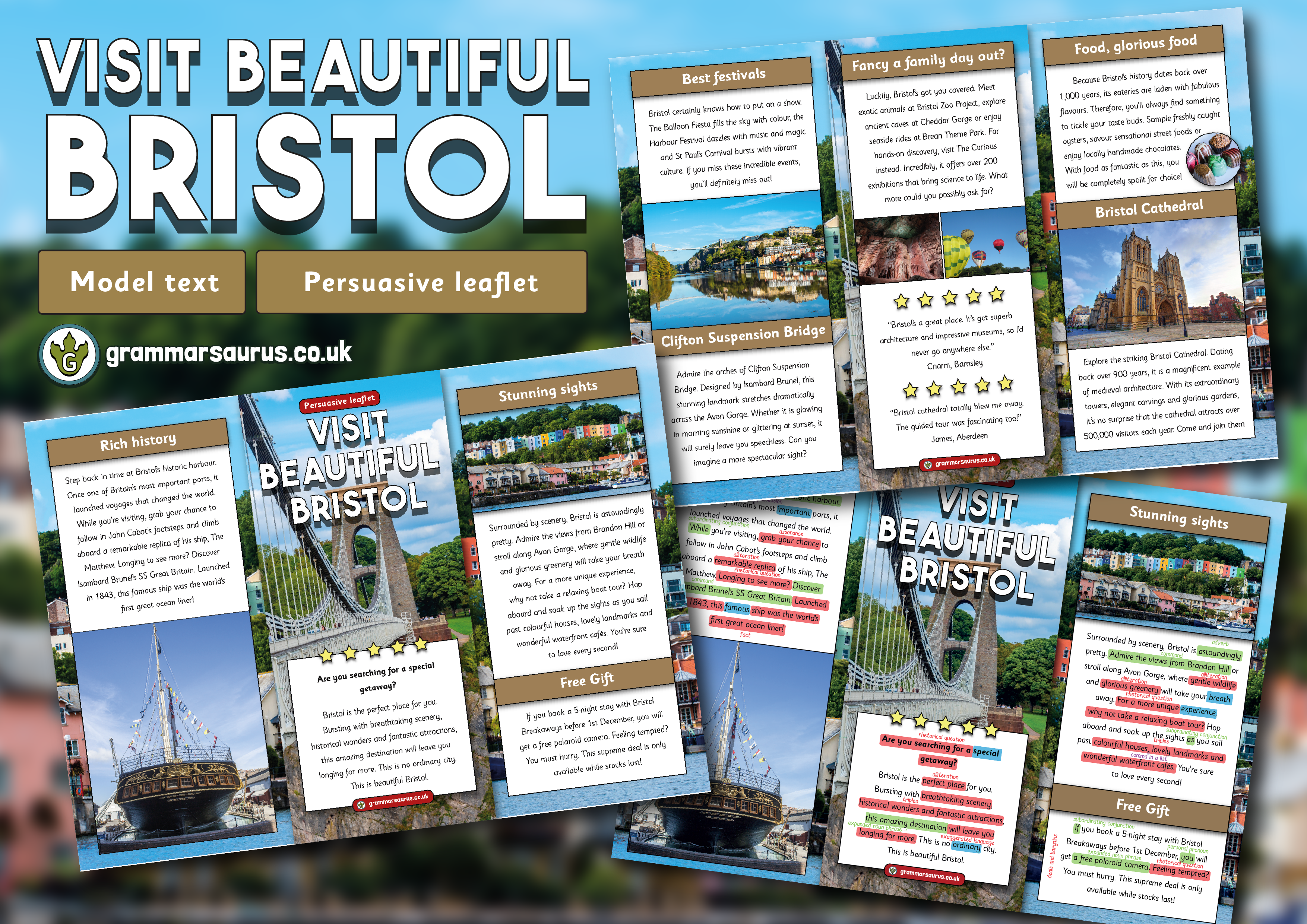 el text is a piece of persuasive writing trying to convince tourists to visit Barnsley. It has been written to meet the Year 4 expected standard and comes with a handy annotated version detailing the text-type specific features (red), grammar (green), punctuation (purple) and spelling (blue) teaching opportunities should you wish to use this text with your learners.
