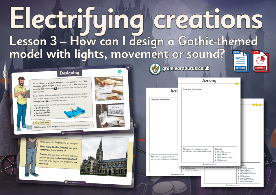 In this lesson, the children will use their understanding of Gothic architecture and electrical and mechanical systems to design their own Gothic-themed model. They will develop and communicate their ideas through annotated sketches or computer-aided design (CAD), showing key features such as structure, strength, and special effects created by circuits or moving parts. Pupils will label materials, joins, and components clearly and explain how their design meets the design criteria.