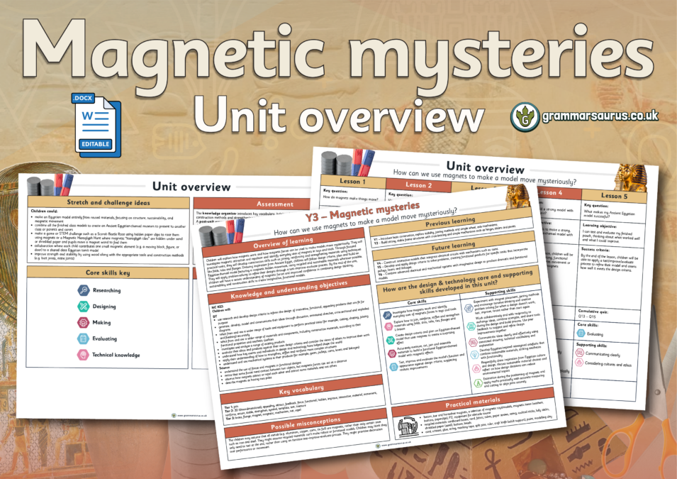 This editable unit overview offers a medium-term plan for Year 6's ‘How can we use magnets to make a model move mysteriously?’ DT construction topic.