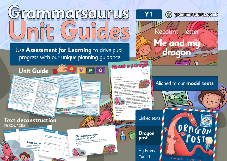 Grammarsaurus unit guides are designed to support teachers in creating a bespoke learning journey for their children. Each step of the journey has its purpose outlined along with our recommendations. Following that, the structure of the step is detailed in an easy-to-follow sequence, and to make things even simpler for you, we’ve exemplified this sequence with a suggested lesson fit for this unit.
