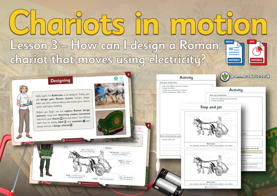 This editable lesson focuses on the core Design and Technology (DT) skill of designing. In this lesson, children will design an electrically powered Roman chariot by sketching and annotating their ideas. They will set clear design criteria, show how electricity will be used to create movement and label key components. Children will explain their design choices before moving on to the making stage. The file includes the following resources: - editable teaching presentation - editable activity worksheets - editable lesson plan - editable focus assessment worksheet National Curriculum objectives Design & Technology: Year 4 Pupils should be taught to:
