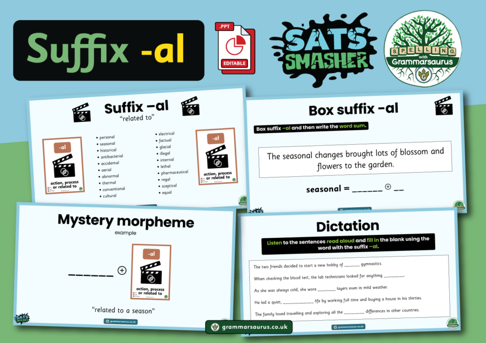 From our research, we know that suffix -al has appeared in the Key Stage Two SATs spelling test with a 100% frequency. This resource showcases many different words containing the suffix -al and offers three different types of activity that will support children building words that contain this morpheme....