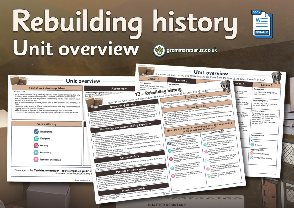 This editable unit overview offers a medium-term plan for Year 2's 'Rebuilding history - How can we build strong and stable houses like those from the time of the Great Fire of London?’ DT construction topic. The file includes the following resources:– links to prior and future learning related to the topic– National Curriculum (NC) objectives covered in the unit– a brief overview of each lesson– common misconceptions students may have– key vocabulary for teaching and explaining– core and supporting skills covered in the unit– practical materials required– ideas for stretching and challenging students– suggestions for assessment...