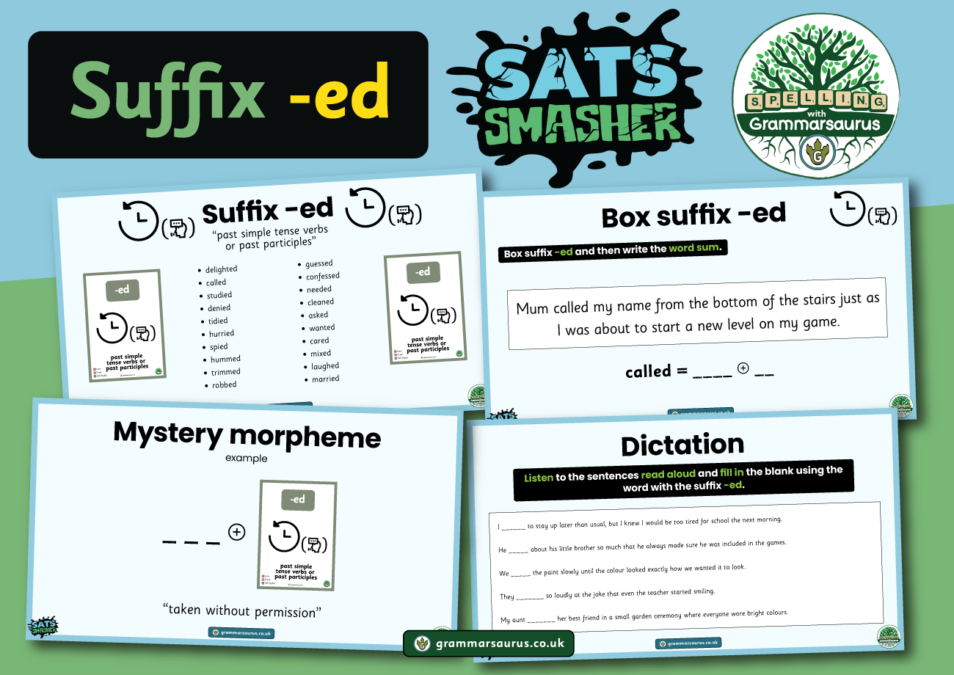 From our research, we know that suffix -ed has appeared in the Key Stage Two SATs spelling test with a 100% frequency. This resource showcases many different words containing the suffix -ed and scaffolds children to break each of these down into its morphemes to support their spelling....