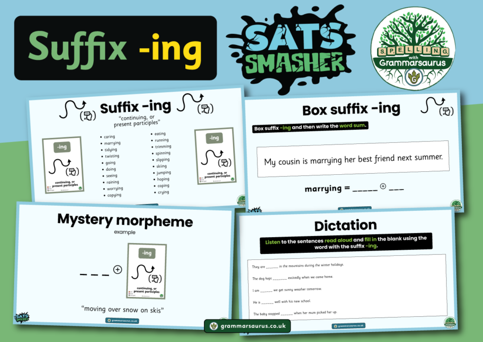From our research, we know that suffix -ing has appeared in the Key Stage Two SATs spelling test with a 100% frequency. This resource showcases many different words containing the suffix -ing and scaffolds children to break each of these down into its morphemes to support their spelling....