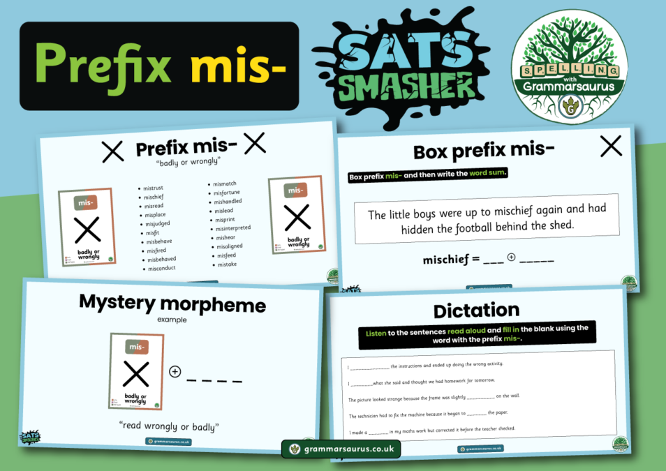 From our research, we know that prefix mis- has appeared in the Key Stage Two SATs spelling test with a 100% frequency. This resource showcases many different words containing the prefix mis- and scaffolds children to break each of these down into its morphemes to support their spelling....