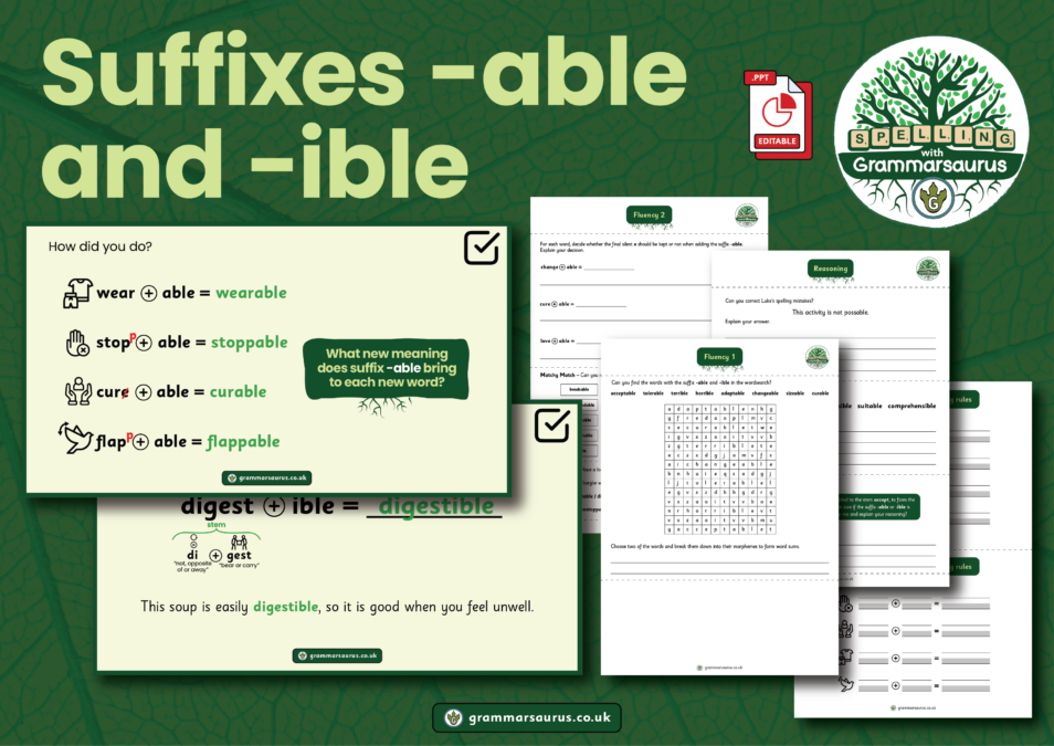In this objective, children will learn how to add the suffixes -able and -ible to a base or stem to form new words. Over five 20-minute lessons, they will: