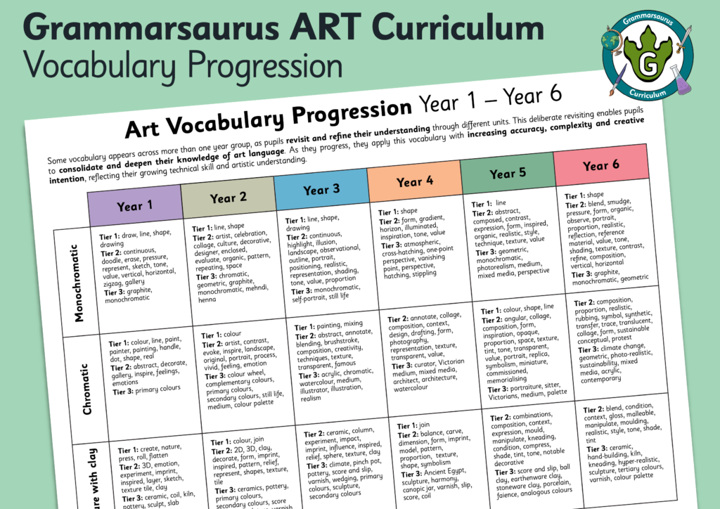 This editable document maps the vocabulary progression used within the Grammarsaurus Art curriculum. Years 1 – 6 are included. Updated