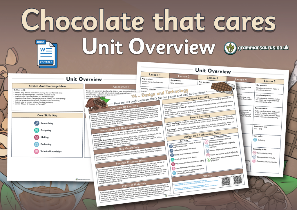 This editable unit overview offers a medium-term plan for Year 4's ‘Chocolate that cares’ topic. The file includes the following