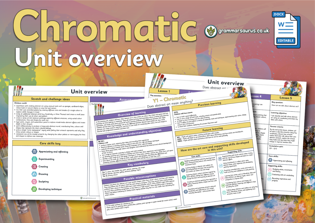 This editable unit overview offers a medium-term plan for Year 1's ‘Chromatic’ art topic. The file includes the following resources:–