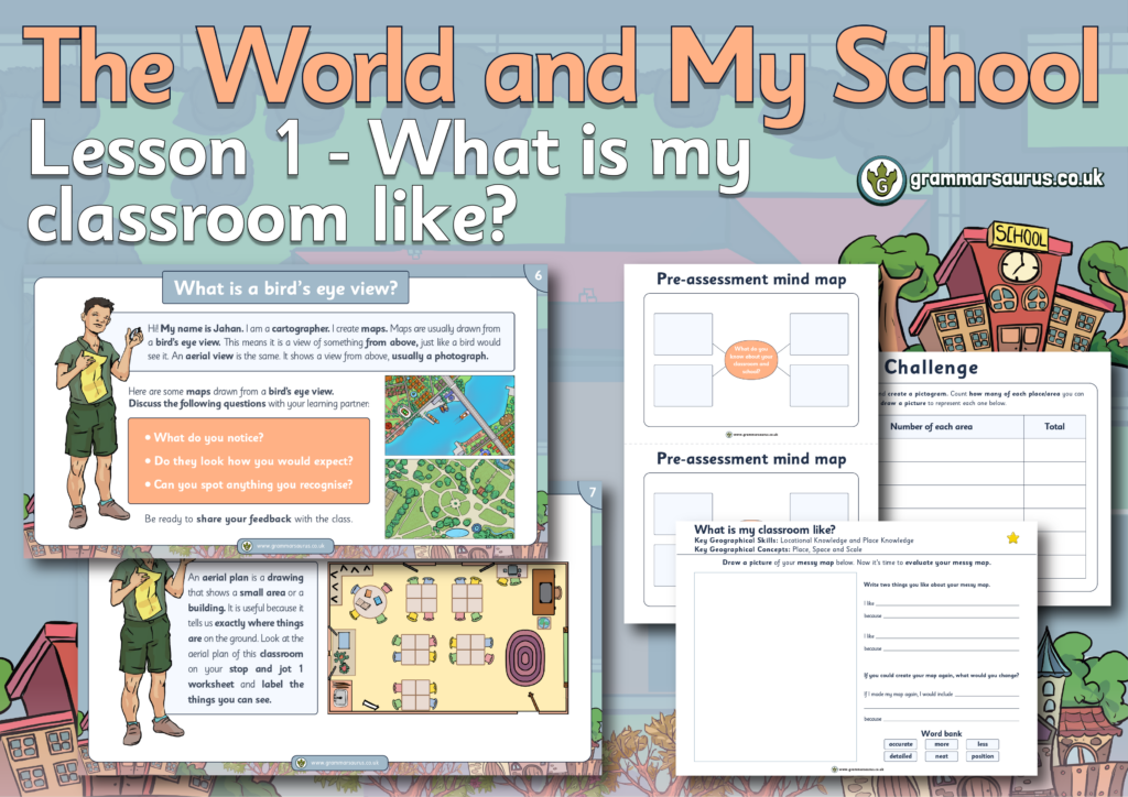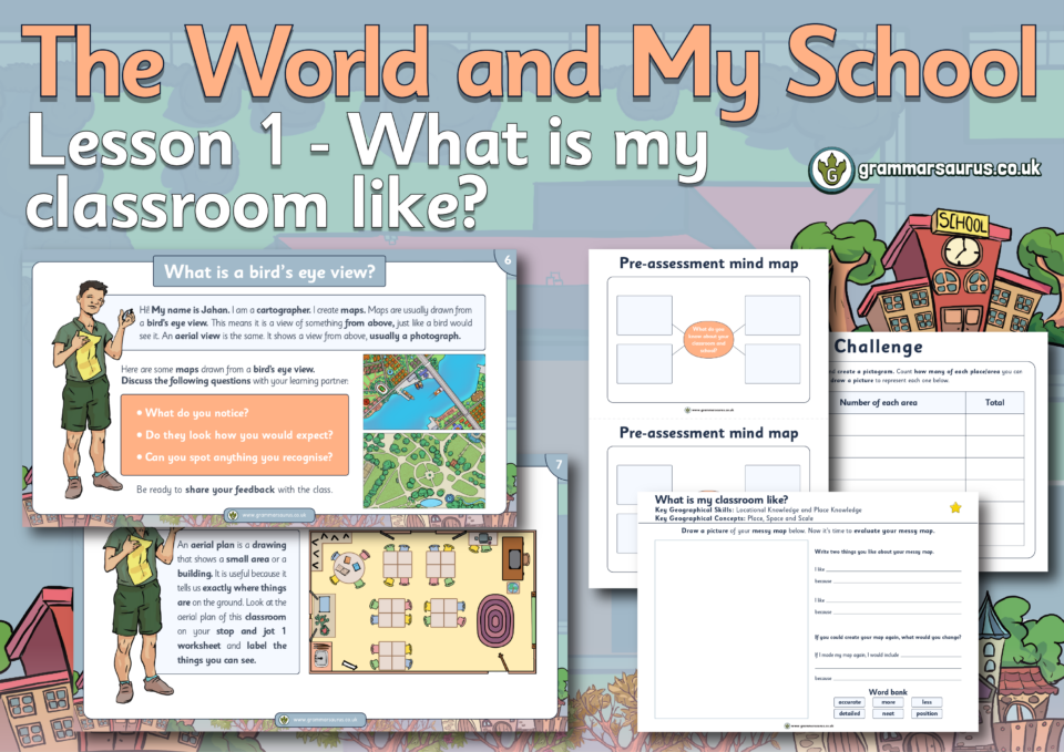 These display resources accompany our Year 1 'The world and my school' unit lessons. Updated to the Grammarsaurus Curriculum 2.0...