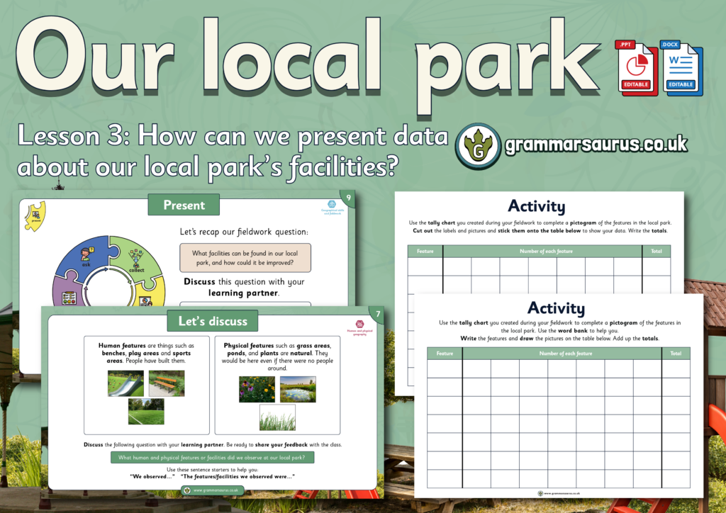 This geography lesson focuses on exploring the facilities observed in the local park. Children will present what they found during