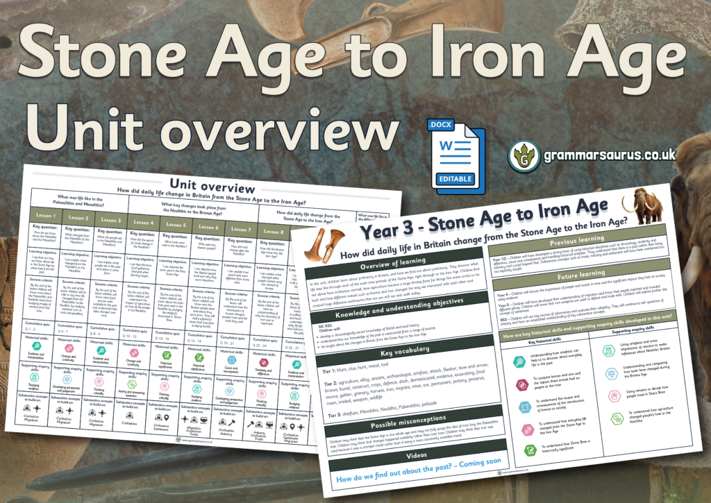 This editable unit overview offers a medium-term plan for Year 3's Stone Age to Iron Age topic. The file includes