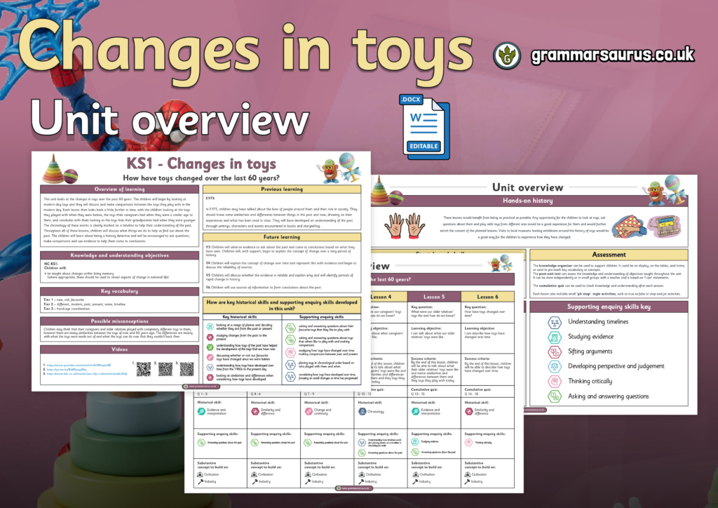 This editable unit overview offers a medium-term plan for Year 1's ‘Changes in Toys' topic. The file includes the following