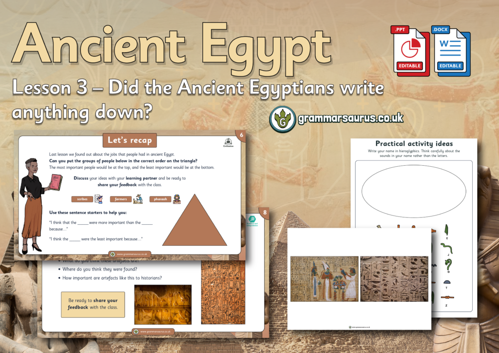 This editable lesson pack focuses on what the ancient Egyptians wrote down. The file includes the following resources: - editable