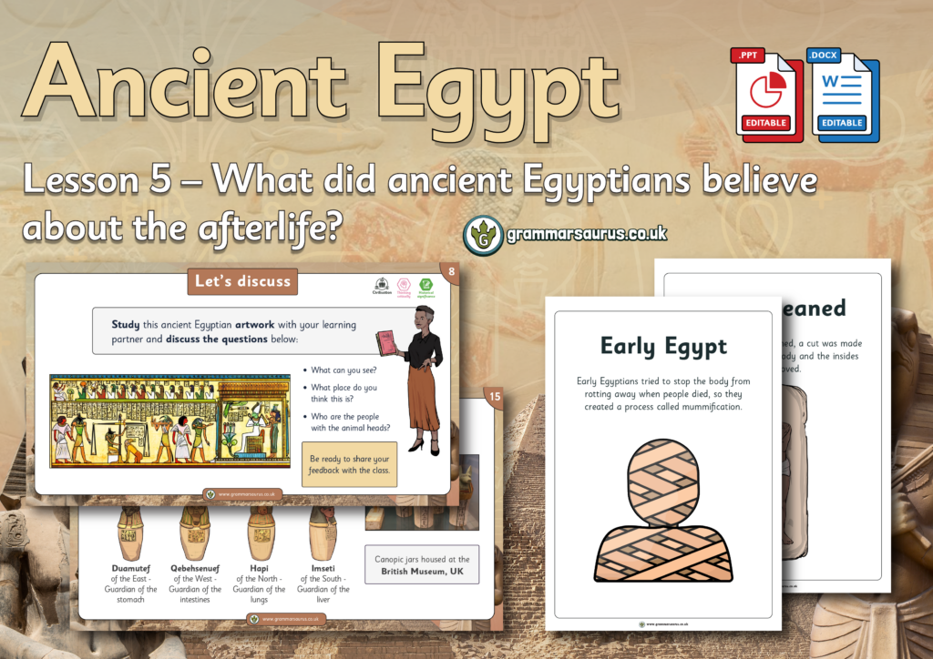 This editable lesson pack focuses on the ancient Egyptian belief of the afterlife and the process of mummification. The file
